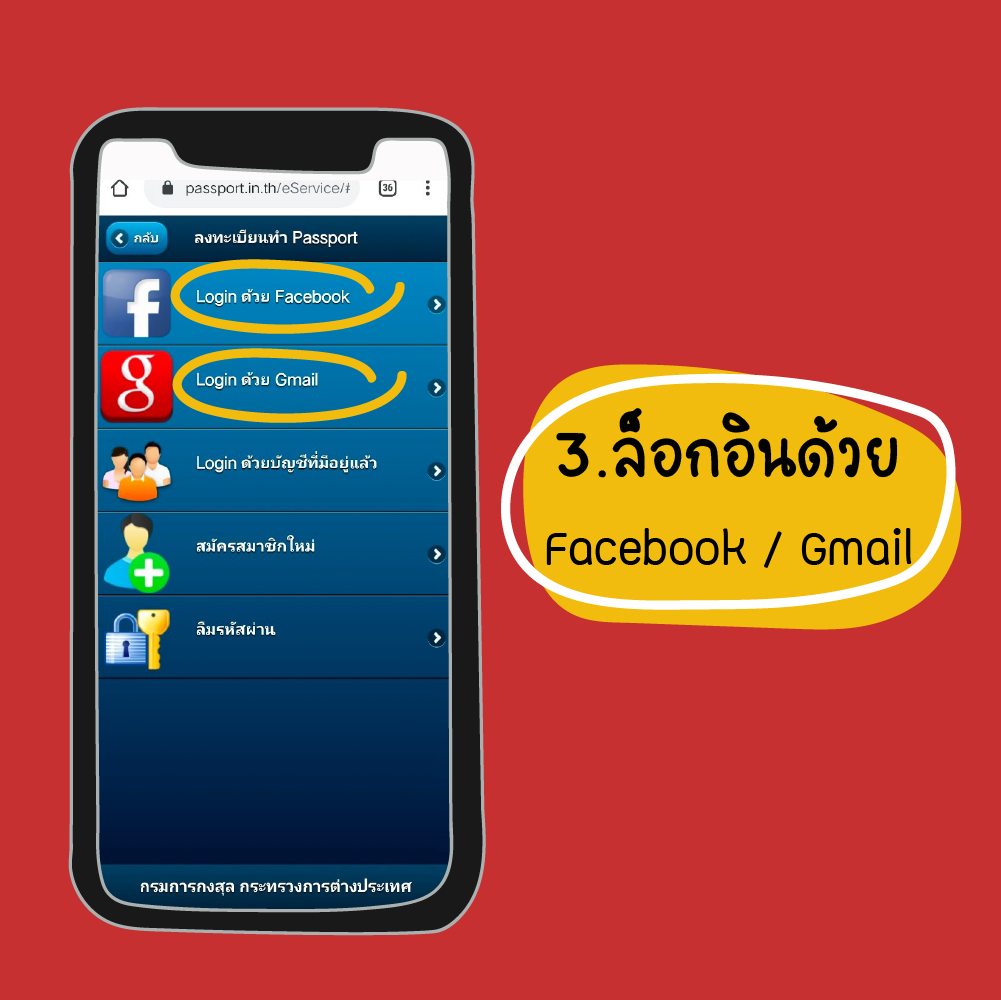 เลือกที่ ลงทะเบียนทำ Passport จากนั้นล็อกอินผ่าน Facebook หรือ Gmail เพื่อสมัครสมาชิกเข้าสู่ระบบ