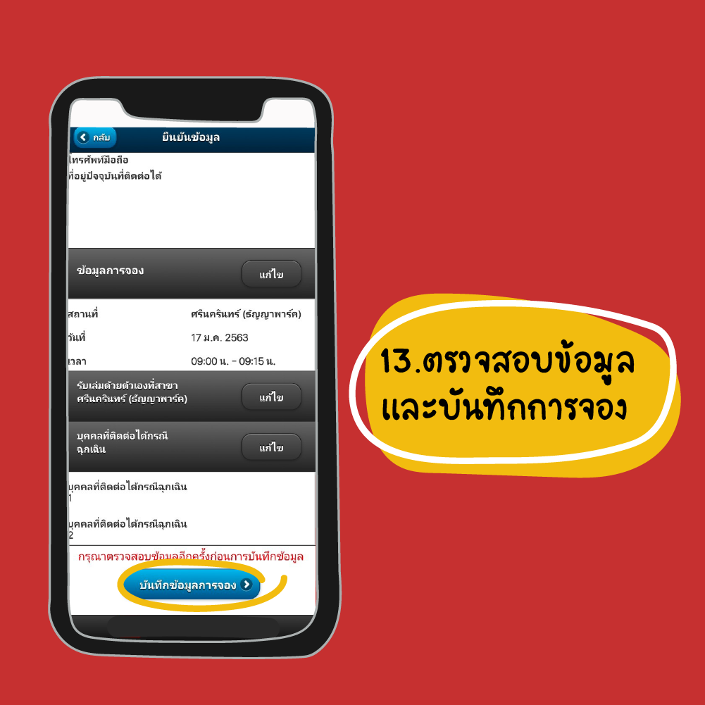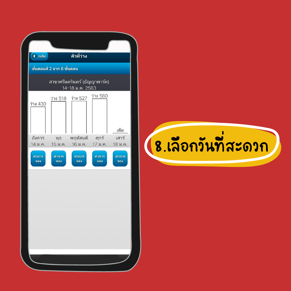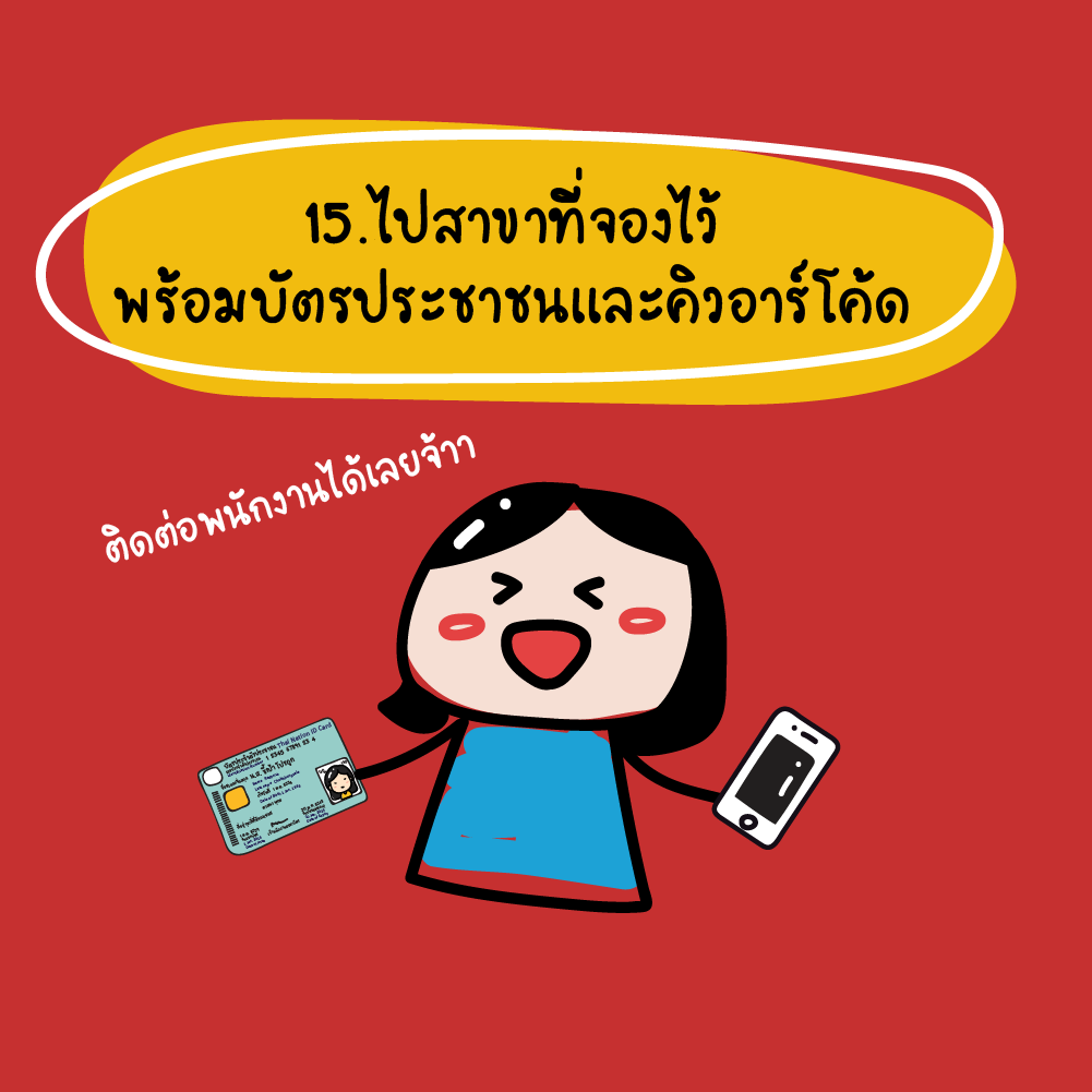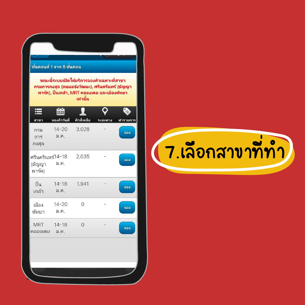 เมื่อถึงวันที่เราจองคิวก็ไปที่สาขาที่เราจองได้เลย ซึ่งจะต้องไปถึงที่สาขาก่อน 30 นาทีจะดีกว่า