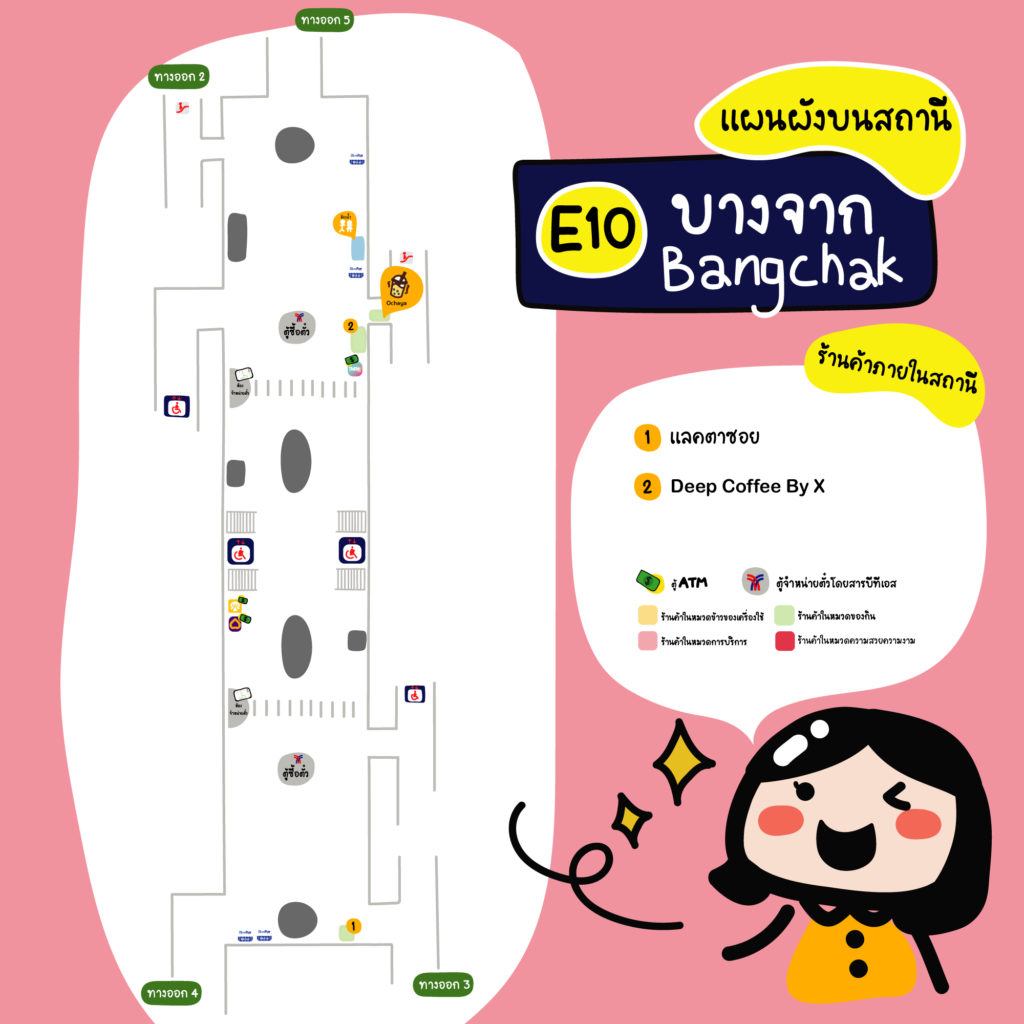 บนสถานีมีร้านขายเครื่องดื่มและห้องน้ำให้ แต่ถ้าใครหิวต้องลองไปเดินตลาดบางจาก