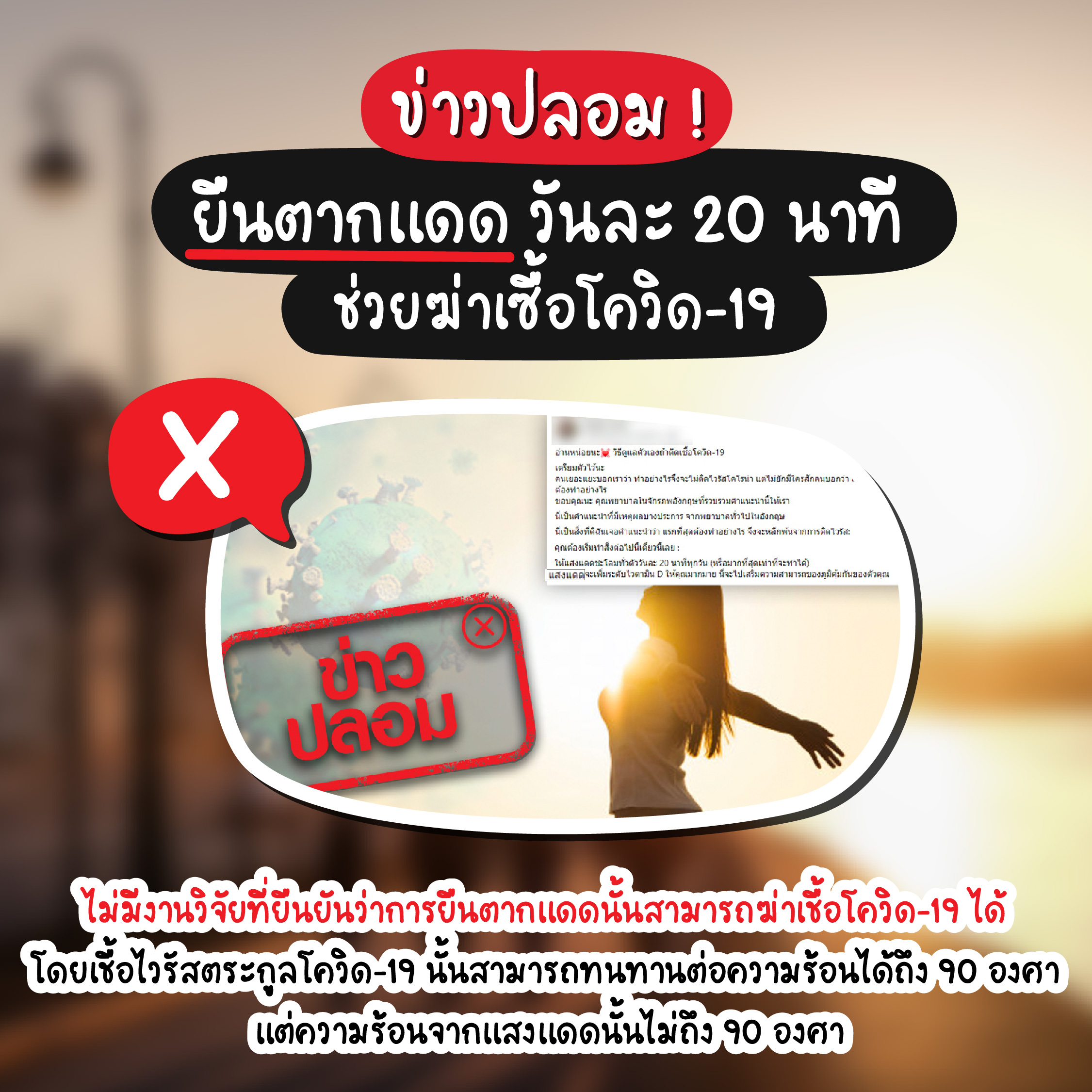 ถึงแดดเมืองไทยจะร้อนแค่ไหน ก็ไม่สามารถฆ่าเชื้อโควิด-19 ได้อยู่ดีนะจ๊ะ เพราะเจ้าโควิดสามารถทนทานต่อความร้อนได้ถึง 90 องศา แต่ความร้อนจากแสงแดดนั้น มีความร้อนไม่ถึง 90 องศาแน่นอน ไม่งั้นก็เป็นลมกันหมดน่ะสิ