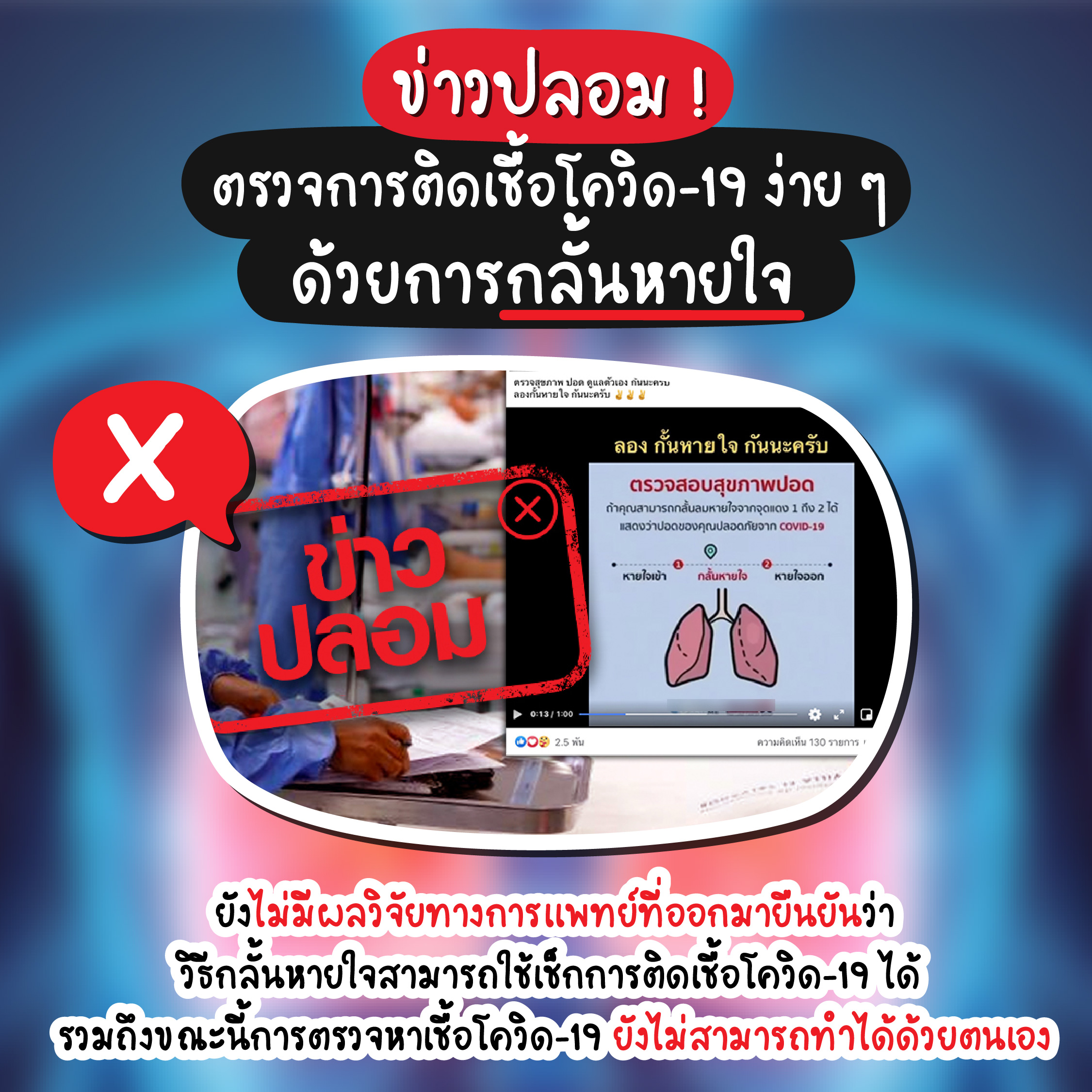 ถ้าใครเคยเห็นคลิปที่อ้างว่าการกลั้นหายใจ 10 วินาที สามารถเช็คได้ว่าปอดเราแข็งแรงและปลอดภัยจากโควิด-19 มั้ย ก็คือไม่จริงน้า ใครสามารถกลั้นหายใจได้ตามคลิปก็คือเก่งมาก แต่ไม่ได้ยืนยันว่าในร่างกายเราจะปลอดภัยจากโควิด-19 อยู่ดีนะจ๊ะ เพราะยังไม่มีผลวิจัยทางการแพทย์ที่ออกมายืนยันว่า วิธีที่ว่าสามารถใช้เช็คการติดเชื้อโควิด-19 ได้ อีกทั้งการตรวจหาเชื้อ ณ ตอนนี้ ยังไม่สามารถทำได้ด้วยตนเองนะจ๊ะ