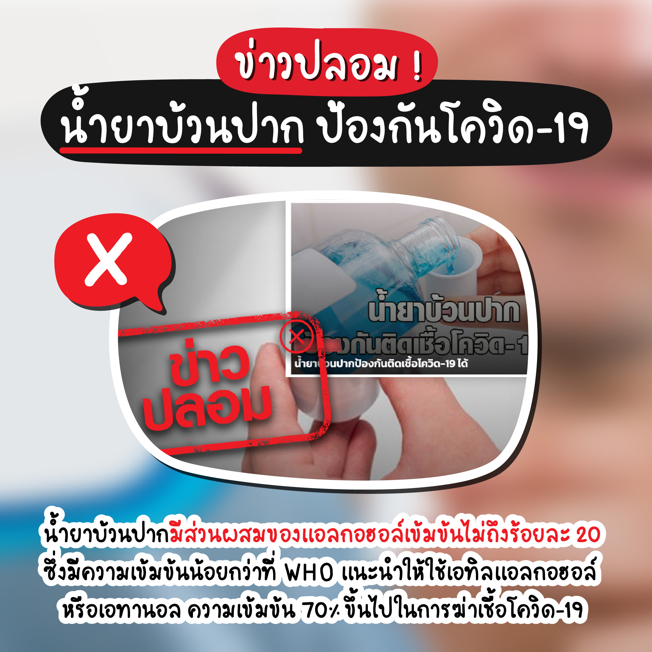 ความเข้มข้นของแอลกอฮอล์ที่ WHO แนะนำในการฆ่าเชื้อโควิด-19 จะอยู่ที่ 70% ขึ้นไป แต่ว่าน้ำยาบ้วนปากมีส่วนผสมของแอลกอฮอล์อยู่ไม่ถึง 20% ด้วยซ้ำ ถ้าจะใช้บ้วนปากทุกวันเพราะจะเอามาฆ่าเชื้อโควิด-19 ก็คือไม่ได้ผลอยู่ดี แต่อาจจะได้ลมหายใจที่สดชื่นแทน