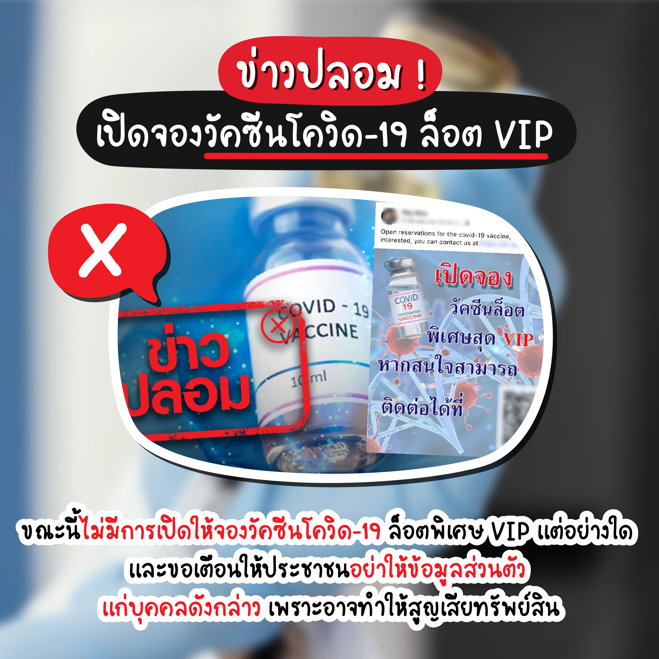 ข่าวนี้ยิ่งต้องระวังเป็นพิเศษเลย อย่าหลงเชื่อเป็นอันขาด เพราะขณะนี้นอกจากจะยังไม่มีการเปิดจองวัคซีนล็อตพิเศษแล้ว ถ้าหากให้ข้อมูลส่วนตัวไปอาจถูกนำข้อมูลไปใช้ในทางที่ไม่ดี และทำให้เราเสียทรัพย์สินได้น้า