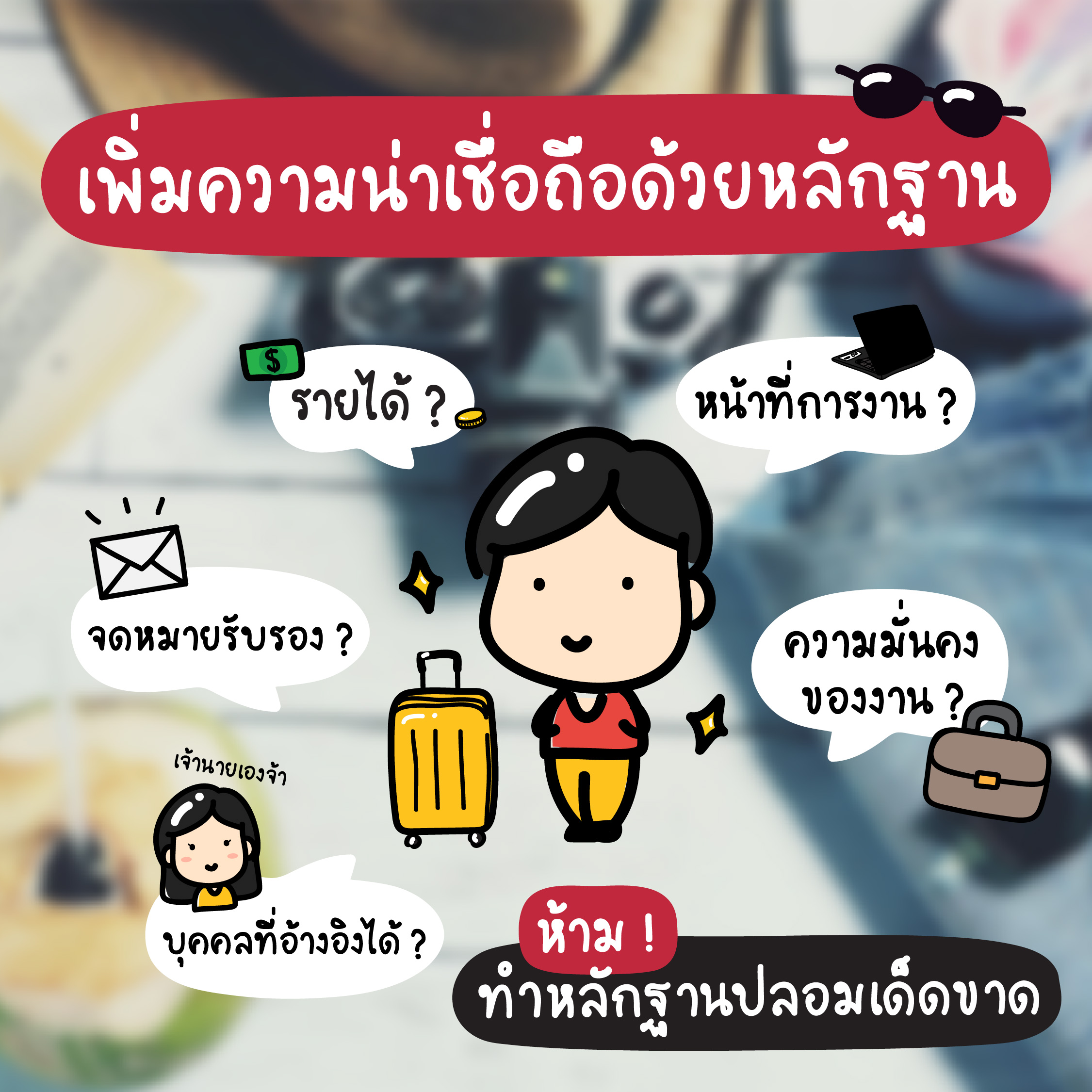 ยิ่งมีหลักฐานมากเท่าไหร่ ก็ยิ่งเพิ่มความน่าเชื่อถือมากเท่านั้น ! โดยปกติเจ้าหน้าที่จะดูองค์ประกอบรวม ๆ อย่างเช่น หน้าที่การงาน รายได้ หรือบุคคลที่อ้างอิงได้ ซึ่งยิ่งมีหลักฐานมายืนยัน ยังไงก็ขอวีซ่าผ่านอยู่แล้ว แต่ข้อต้องห้ามเพียงอย่างเดียวที่ไม่ควรทำเลยคือการสร้างหลักฐานปลอมหรือโกหก เพราะถ้าโดนจับได้ นอกจากจะไม่ได้วีซ่าแล้วยังอาจโดนแบล็คลิสท์ไม่ให้เข้าประเทศนั้น ๆ อีกเลยด้วยนะ บรึ๋ยยย😱