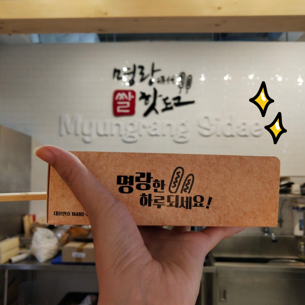มาถึงร้าน Myungrang Sidae จะมีป้ายร้านภาษาเกาหลีโดดเด่นอยู่ที่หน้าร้าน บรรยากาศในร้านให้ความคาเฟ่เกาหลีสีขาวเพลน ๆ น่ารักสุดๆ ! ว่าแล้วก็สั่งเมนูที่ต้องการกันได้เลย! รอบนี้เราจะมาสั่งเมนูมอสซาเรลล่าชีสฮอตด็อกในราคาไม้ละ 69 บาท ได้มาแล้ว มาพร้อมกับกล่องน่ารัก ๆ สำหรับไม้เดียว ~ บอกให้เค้าโรยน้ำตาลเพิ่มความหวานได้ด้วยนะ ส่วนซอสเติมได้ไม่อั้นเลยนะ สามารถหยิบมาใส่เพิ่มเองได้ตามความชอบ~ เรียบร้อยยย ~ หน้าตาน่าทาน รสชาติสุดยอดดดดมีความยืดของชีสฟิน ๆ ไส้กรอกเนื้อแน่น และแป้งที่นุ่มและกรอบในเวลาเดียวกัน เต็มคำแบบสุด ๆ
