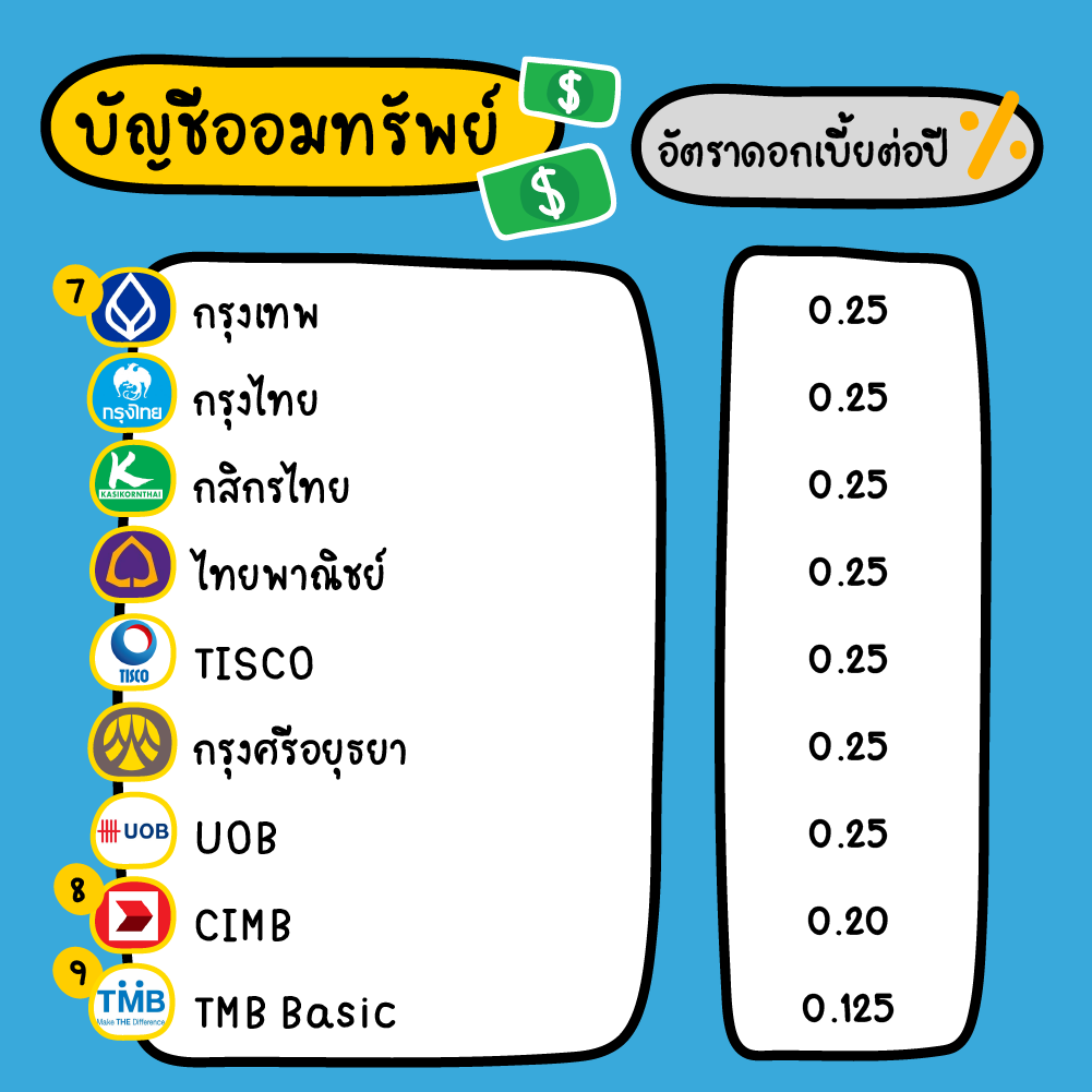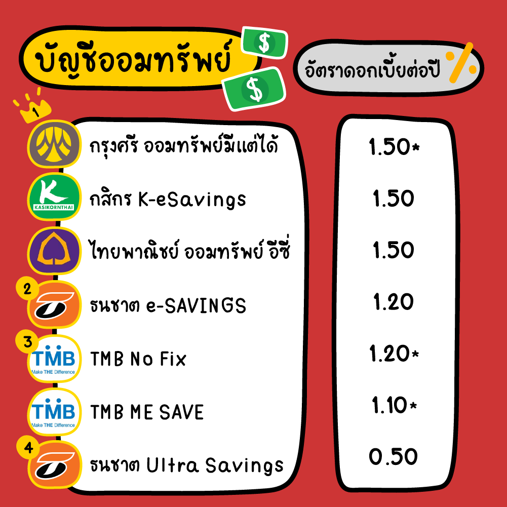 จุดเด่นหลัก ๆ ของการออมเงินด้วยบัญชีออมทรัพย์ นั่นก็คือไม่มีจำกัดในการออมเงิน นอกเหนือจากการฝากขั้นต่ำเปิดบัญชีครั้งแรกแล้ว ครั้งต่อ ๆ ไปก็สามารถฝากได้แบบไม่มีขั้นต่ำ ไม่มีเฉพาะเจาะจงช่วงเวลาการฝาก ทำให้มีความยืดหยุ่นในการออมเงินสูง ตามใจฉันได้เลย สำหรับบัญชีนี้จะมีเงื่อนไขการได้รับดอกเบี้ยต่างกันนิดนึงคือถ้าเปิดบัญชีผ่านแอพจะได้รับดอกเบี้ย 1.50% เมื่อยอดเงินฝากเกิน 100,000 บาทจะถูกปรับเป็น 1.00% แต่ถ้าเปิดบัญชีที่สาขาจะได้รับดอกเบี้ยอยู่ที่ 1.10% เมื่อยอดเงินฝากเกิน 100,000 บาทจะถูกปรับเป็น 1.00% เช่นกัน โดยมีเงื่อนไขเพิ่มเติมคือ ฟรีค่าธรรมเนียมการถอนเงิน/โอนเงิน 2 ครั้งแรกในแต่ละเดือน หลังจากนั้นจะต้องเสียค่าธรรมเนียมครั้งละ 50 บาทด้วย เพราะฉะนั้นอาจจะเหมาะกับคนที่มีวินัยในการออมนิดนึงนะ ขั้นต่ำในการเปิดบัญชี : ไม่มีขั้นต่ำ (สำหรับเปิดบนแอพ) , 500 บาท (สำหรับเปิดที่สาขา) จำนวนครั้งในการจ่ายดอกเบี้ย : จ่ายดอกเบี้ยทุกเดือน เป็นบัญชีแบบ E-Savings ไม่มีสมุดบัญชี สามารถสมัครออนไลน์ได้ด้วยนะ โดยถ้าเรามีวงเงินฝากไม่เกิน 100,000 บาท จะได้รับดอกเบี้ยที่ 1.50% และหากมีวงเงินที่เกินจาก 100,000 บาท ขึ้นไป จะคิดดอกเบี้ยเป็น 0.50% นะ ขั้นต่ำในการเปิดบัญชี : ไม่มีขั้นต่ำในการฝาก จำนวนครั้งในการจ่ายดอกเบี้ย : 2 ครั้ง (เดือนมิถุนายนและธันวาคม) เป็นบัญชีแบบ E-Savings ไม่มีสมุดบัญชี สามารถสมัครออนไลน์ได้ด้วยนะ สามารถรับดอกเบี้ยสูง 1.5% สำหรับยอดเงินฝากที่ไม่เกิน 5,000,000 บาท หลังจาก 5,000,000 บาทเป็นต้นไปจะปรับดอกเบี้ยเป็น 0.50% ขั้นต่ำในการเปิดบัญชี : 500 บาท จำนวนครั้งในการจ่ายดอกเบี้ย : 2 ครั้ง (ทุกวันที่ 25 มิถุนายน และ 25 ธันวาคม) เป็นบัญชีแบบ E-Savings ไม่มีสมุดบัญชี สามารถสมัครออนไลน์ได้ด้วยนะ สามารถรับดอกเบี้ยสูง 1.20% สำหรับยอดเงินฝากที่ไม่เกิน 5,000,000 บาท หลังจาก 5,000,000 บาทเป็นต้นไปจะปรับดอกเบี้ยเป็น 0.50% ขั้นต่ำในการเปิดบัญชี : ไม่มีขั้นต่ำในการฝาก จำนวนครั้งในการจ่ายดอกเบี้ย : 2 ครั้ง (เดือนมิถุนายนและธันวาคม) ออมเงินแบบสบาย ๆ ถอนเมื่อไหร่ก็ได้ ไม่จำกัดจำนวนครั้ง แต่มีเงื่อนไขว่าต้องใช้ ทีเอ็มบี ออลฟรี อย่างน้อย 5 ครั้ง/เดือนเพื่อรับดอกเบี้ย 1.2% ถ้าหากไม่เป็นไปตามเงื่อนไขจะได้รับดอกเบี้ยเป็น 0.3% ขั้นต่ำในการเปิดบัญชี : ไม่มีขั้นต่ำในการฝาก จำนวนครั้งในการจ่ายดอกเบี้ย : 2 ครั้ง (เดือนมิถุนายนและธันวาคม) โดยมีข้อแม้ว่าในทุกเดือนจะต้องมีเงินฝากมากกว่าเงินถอน ถ้าหากเดือนไหนมียอดถอนมากกว่ายอดฝาก ดอกเบี้ยจะถูกปรับเป็น 0.40% ขั้นต่ำในการเปิดบัญชี : ไม่มีขั้นต่ำในการฝาก จำนวนครั้งในการจ่ายดอ