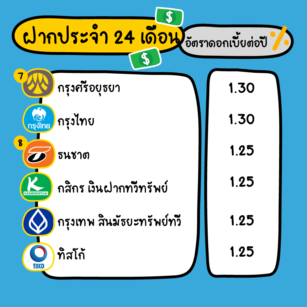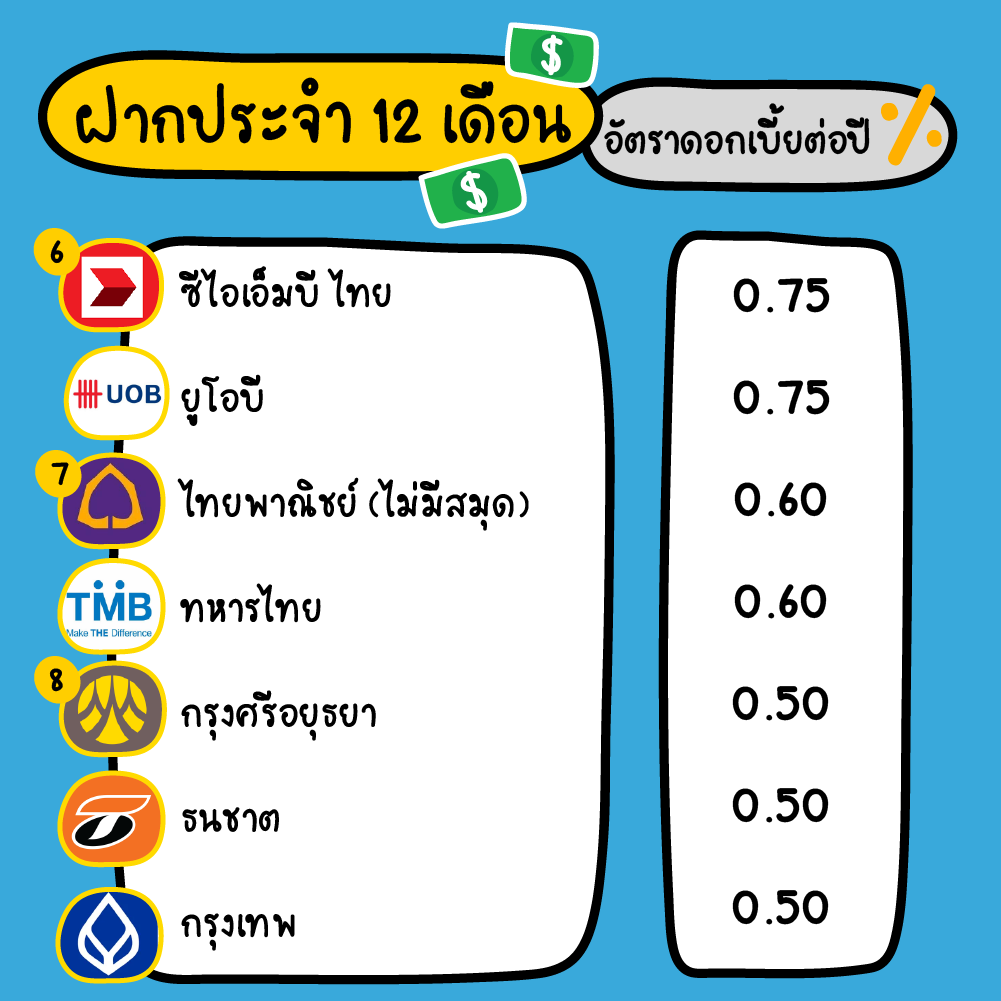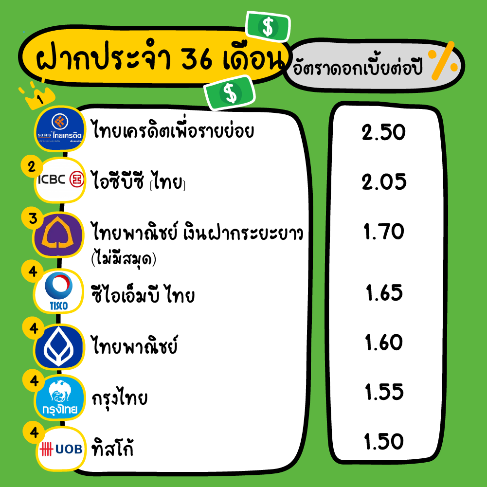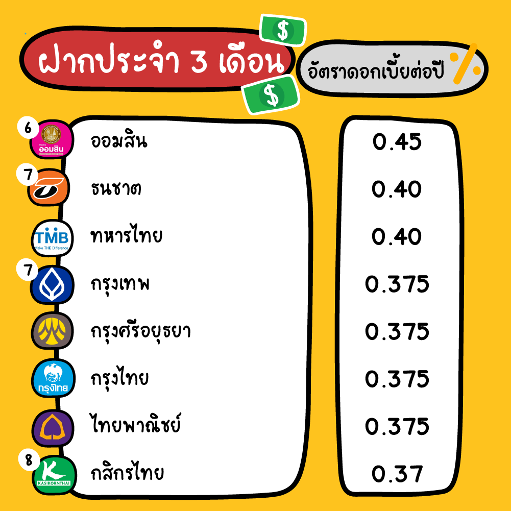 อีกหนึ่งรูปแบบการออมเงินที่เหมาะกับคนที่ต้องการออมเงินอย่างจริงจัง เพิ่มความมีวินัยด้วยการฝากประจำทุกเดือน ทำให้เราสามารถรู้จำนวนเงินออมและคำนวนเงินดอกเบี้ยที่จะได้ล่วงหน้าคร่าว ๆ ได้เลย โดยจะมีให้เลือกฝากประจำแต่ละธนาคารที่จำนวนแตกต่างกันไป เราจะเลือกที่จำนวนเดือน 3 , 6 , 12 , 24 เดือนนะ ขั้นต่ำในการเปิดบัญชี : ไม่มีขั้นต่ำในการฝาก จำนวนครั้งในการจ่ายดอกเบี้ย : เมื่อครบกำหนดระยะเวลาการฝาก ตามระยะเวลาการฝากที่เลือก ขั้นต่ำในการเปิดบัญชี : 1000 บาท จำนวนครั้งในการจ่ายดอกเบี้ย : เมื่อครบกำหนดระยะเวลาการฝาก ตามระยะเวลาการฝากที่เลือก ขั้นต่ำในการเปิดบัญชี : 5000 บาท จำนวนครั้งในการจ่ายดอกเบี้ย : เมื่อครบกำหนดระยะเวลาการฝาก ตามระยะเวลาการฝากที่เลือก ขั้นต่ำในการเปิดบัญชี : 30,000 บาท จำนวนครั้งในการจ่ายดอกเบี้ย : เมื่อครบกำหนดระยะเวลาการฝาก ตามระยะเวลาการฝากที่เลือก ขั้นต่ำในการเปิดบัญชี : 1000 บาท จำนวนครั้งในการจ่ายดอกเบี้ย : เลือกรับดอกเบี้ยรายงวดได้ ขั้นต่ำในการเปิดบัญชี : 5000 บาท จำนวนครั้งในการจ่ายดอกเบี้ย : เมื่อครบกำหนดระยะเวลาการฝาก ตามระยะเวลาการฝากที่เลือก ขั้นต่ำในการเปิดบัญชี : 1000 บาท จำนวนครั้งในการจ่ายดอกเบี้ย : เมื่อครบกำหนดระยะเวลาการฝาก ตามระยะเวลาการฝากที่เลือก ขั้นต่ำในการเปิดบัญชี : 1000 บาท จำนวนครั้งในการจ่ายดอกเบี้ย : เมื่อครบกำหนดระยะเวลาการฝาก ตามระยะเวลาการฝากที่เลือก ขั้นต่ำในการเปิดบัญชี : 1000 บาท จำนวนครั้งในการจ่ายดอกเบี้ย : เมื่อครบกำหนดระยะเวลาการฝาก ตามระยะเวลาการฝากที่เลือก ขั้นต่ำในการเปิดบัญชี : 1000 บาท จำนวนครั้งในการจ่ายดอกเบี้ย : เมื่อครบกำหนดระยะเวลาการฝาก ตามระยะเวลาการฝากที่เลือก ขั้นต่ำในการเปิดบัญชี : 2000 บาท จำนวนครั้งในการจ่ายดอกเบี้ย : เมื่อครบกำหนดระยะเวลาการฝาก ตามระยะเวลาการฝากที่เลือก ขั้นต่ำในการเปิดบัญชี : 1000 บาท จำนวนครั้งในการจ่ายดอกเบี้ย : เมื่อครบกำหนดระยะเวลาการฝาก ตามระยะเวลาการฝากที่เลือก ขั้นต่ำในการเปิดบัญชี : 1000 บาท จำนวนครั้งในการจ่ายดอกเบี้ย : เมื่อครบกำหนดระยะเวลาการฝาก ตามระยะเวลาการฝากที่เลือก ขั้นต่ำในการเปิดบัญชี : 1000 บาท จำนวนครั้งในการจ่ายดอกเบี้ย : เมื่อครบกำหนดระยะเวลาการฝาก ตามระยะเวลาการฝากที่เลือก ขั้นต่ำในการเปิดบัญชี : 1000 บาท จำนวนครั้งในการจ่ายดอกเบี้ย : เมื่อครบกำหนดระยะเวลาการฝาก ตามระยะเวลาการฝากที่เลือก ขั้นต่ำในการเปิดบัญชี : 1000 บาท จำนวนครั้งในการจ่ายดอกเบี้ย : เมื่อครบกำหนดระยะเวลาการฝาก ตามระยะเวลาการฝากที่เลือก ขั้นต่ำในการเป