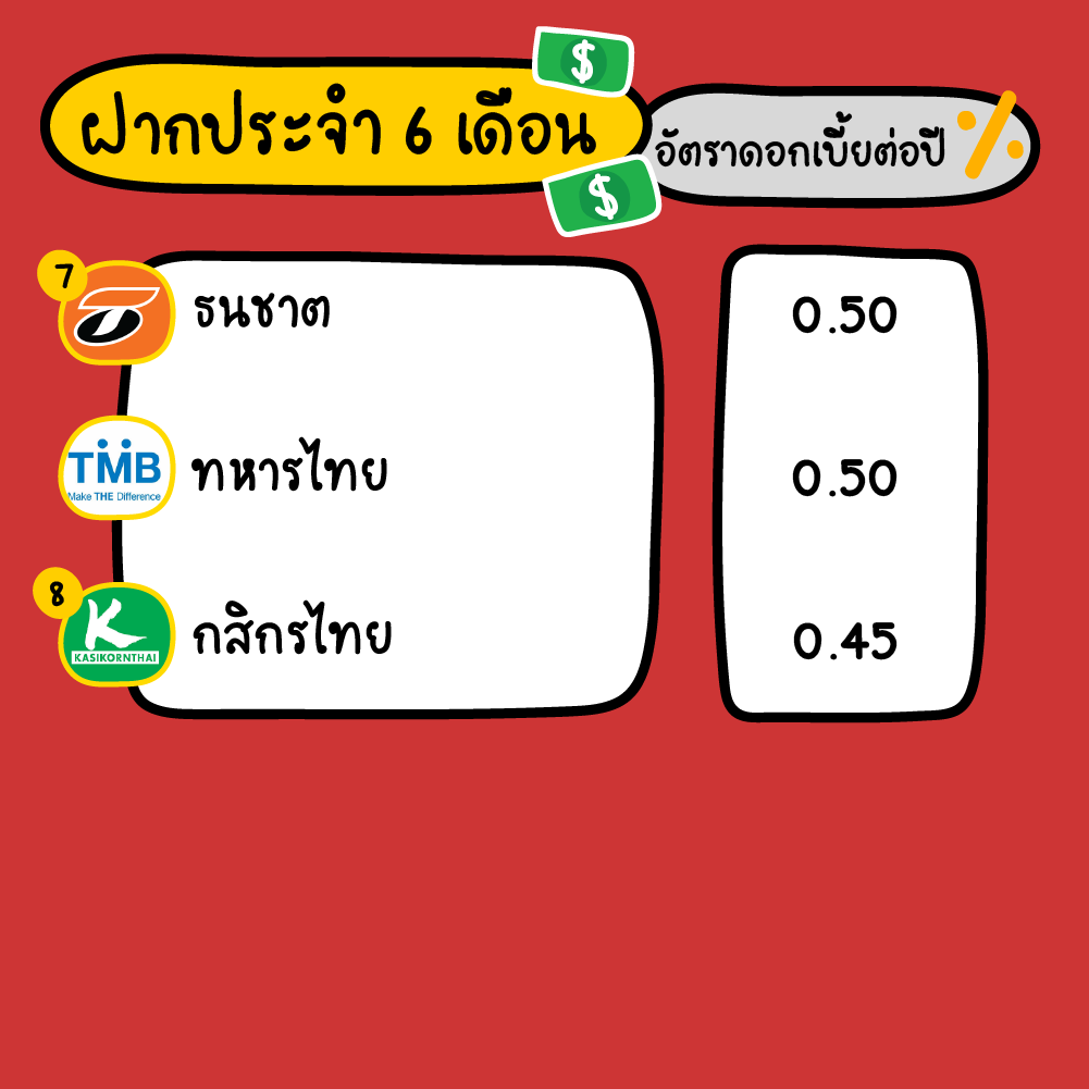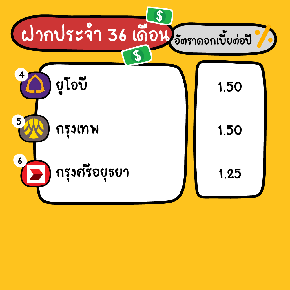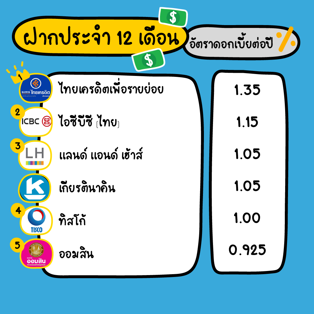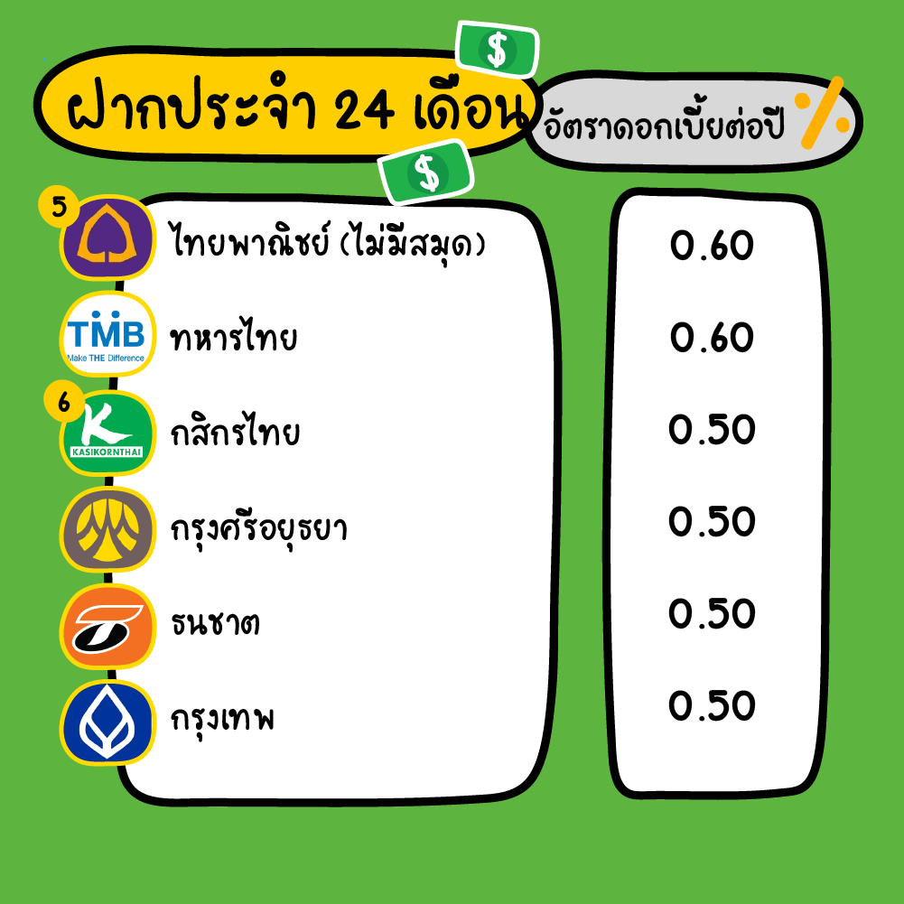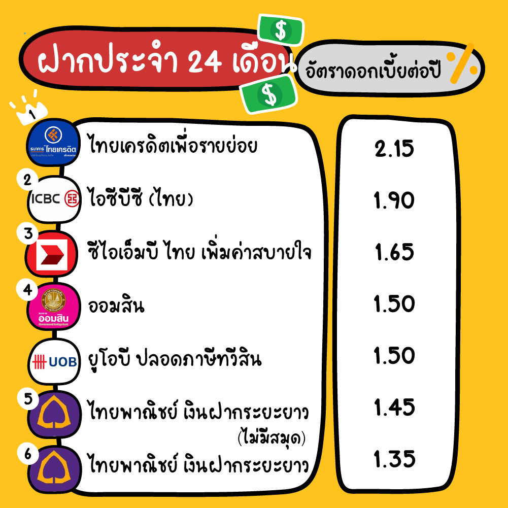 อีกหนึ่งรูปแบบการออมเงินที่เหมาะกับคนที่ต้องการออมเงินอย่างจริงจัง เพิ่มความมีวินัยด้วยการฝากประจำทุกเดือน ทำให้เราสามารถรู้จำนวนเงินออมและคำนวนเงินดอกเบี้ยที่จะได้ล่วงหน้าคร่าว ๆ ได้เลย โดยจะมีให้เลือกฝากประจำแต่ละธนาคารที่จำนวนแตกต่างกันไป เราจะเลือกที่จำนวนเดือน 3 , 6 , 12 , 24 เดือนนะ ขั้นต่ำในการเปิดบัญชี : ไม่มีขั้นต่ำในการฝาก จำนวนครั้งในการจ่ายดอกเบี้ย : เมื่อครบกำหนดระยะเวลาการฝาก ตามระยะเวลาการฝากที่เลือก ขั้นต่ำในการเปิดบัญชี : 1000 บาท จำนวนครั้งในการจ่ายดอกเบี้ย : เมื่อครบกำหนดระยะเวลาการฝาก ตามระยะเวลาการฝากที่เลือก ขั้นต่ำในการเปิดบัญชี : 5000 บาท จำนวนครั้งในการจ่ายดอกเบี้ย : เมื่อครบกำหนดระยะเวลาการฝาก ตามระยะเวลาการฝากที่เลือก ขั้นต่ำในการเปิดบัญชี : 30,000 บาท จำนวนครั้งในการจ่ายดอกเบี้ย : เมื่อครบกำหนดระยะเวลาการฝาก ตามระยะเวลาการฝากที่เลือก ขั้นต่ำในการเปิดบัญชี : 1000 บาท จำนวนครั้งในการจ่ายดอกเบี้ย : เลือกรับดอกเบี้ยรายงวดได้ ขั้นต่ำในการเปิดบัญชี : 5000 บาท จำนวนครั้งในการจ่ายดอกเบี้ย : เมื่อครบกำหนดระยะเวลาการฝาก ตามระยะเวลาการฝากที่เลือก ขั้นต่ำในการเปิดบัญชี : 1000 บาท จำนวนครั้งในการจ่ายดอกเบี้ย : เมื่อครบกำหนดระยะเวลาการฝาก ตามระยะเวลาการฝากที่เลือก ขั้นต่ำในการเปิดบัญชี : 1000 บาท จำนวนครั้งในการจ่ายดอกเบี้ย : เมื่อครบกำหนดระยะเวลาการฝาก ตามระยะเวลาการฝากที่เลือก ขั้นต่ำในการเปิดบัญชี : 1000 บาท จำนวนครั้งในการจ่ายดอกเบี้ย : เมื่อครบกำหนดระยะเวลาการฝาก ตามระยะเวลาการฝากที่เลือก ขั้นต่ำในการเปิดบัญชี : 1000 บาท จำนวนครั้งในการจ่ายดอกเบี้ย : เมื่อครบกำหนดระยะเวลาการฝาก ตามระยะเวลาการฝากที่เลือก ขั้นต่ำในการเปิดบัญชี : 2000 บาท จำนวนครั้งในการจ่ายดอกเบี้ย : เมื่อครบกำหนดระยะเวลาการฝาก ตามระยะเวลาการฝากที่เลือก ขั้นต่ำในการเปิดบัญชี : 1000 บาท จำนวนครั้งในการจ่ายดอกเบี้ย : เมื่อครบกำหนดระยะเวลาการฝาก ตามระยะเวลาการฝากที่เลือก ขั้นต่ำในการเปิดบัญชี : 1000 บาท จำนวนครั้งในการจ่ายดอกเบี้ย : เมื่อครบกำหนดระยะเวลาการฝาก ตามระยะเวลาการฝากที่เลือก ขั้นต่ำในการเปิดบัญชี : 1000 บาท จำนวนครั้งในการจ่ายดอกเบี้ย : เมื่อครบกำหนดระยะเวลาการฝาก ตามระยะเวลาการฝากที่เลือก ขั้นต่ำในการเปิดบัญชี : 1000 บาท จำนวนครั้งในการจ่ายดอกเบี้ย : เมื่อครบกำหนดระยะเวลาการฝาก ตามระยะเวลาการฝากที่เลือก ขั้นต่ำในการเปิดบัญชี : 1000 บาท จำนวนครั้งในการจ่ายดอกเบี้ย : เมื่อครบกำหนดระยะเวลาการฝาก ตามระยะเวลาการฝากที่เลือก ขั้นต่ำในการเป
