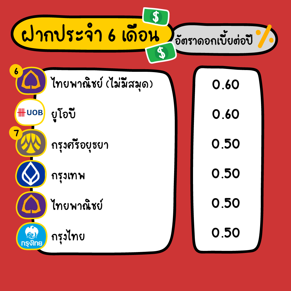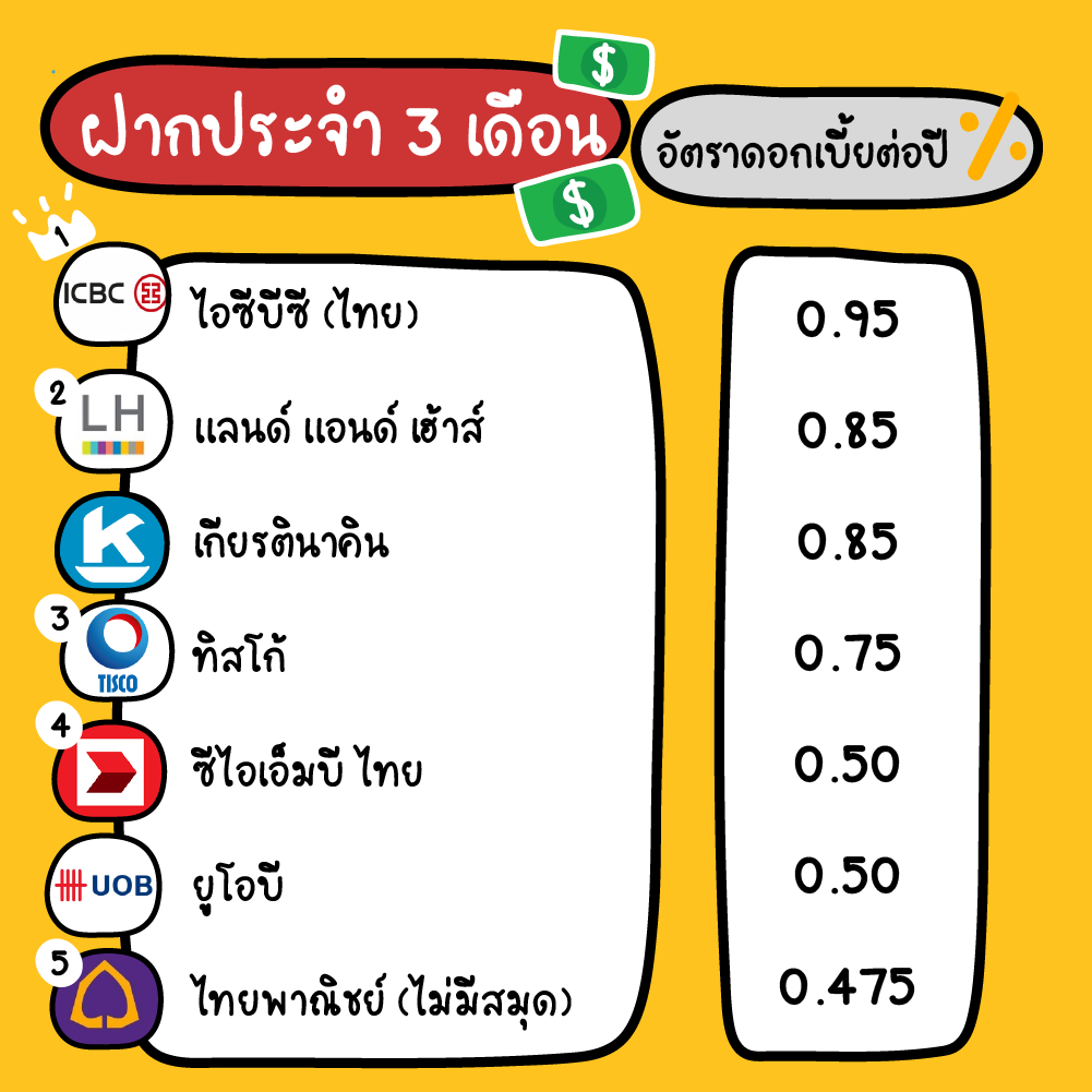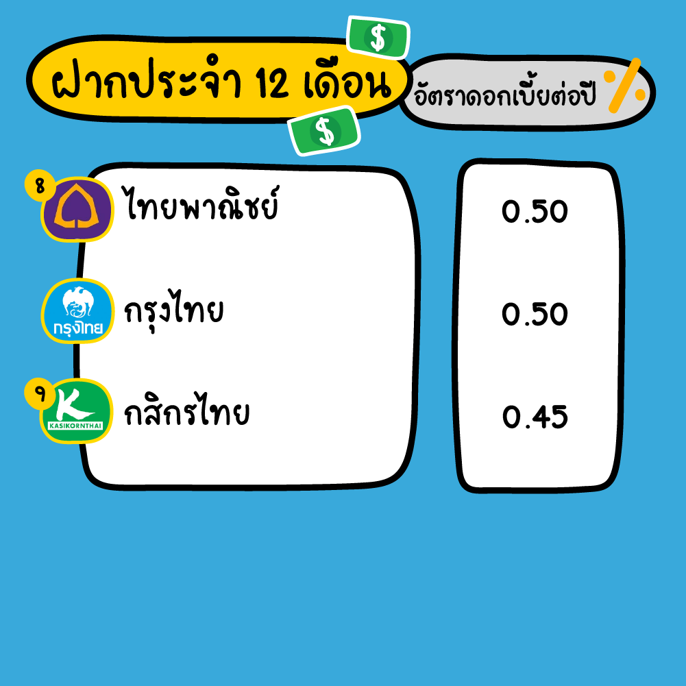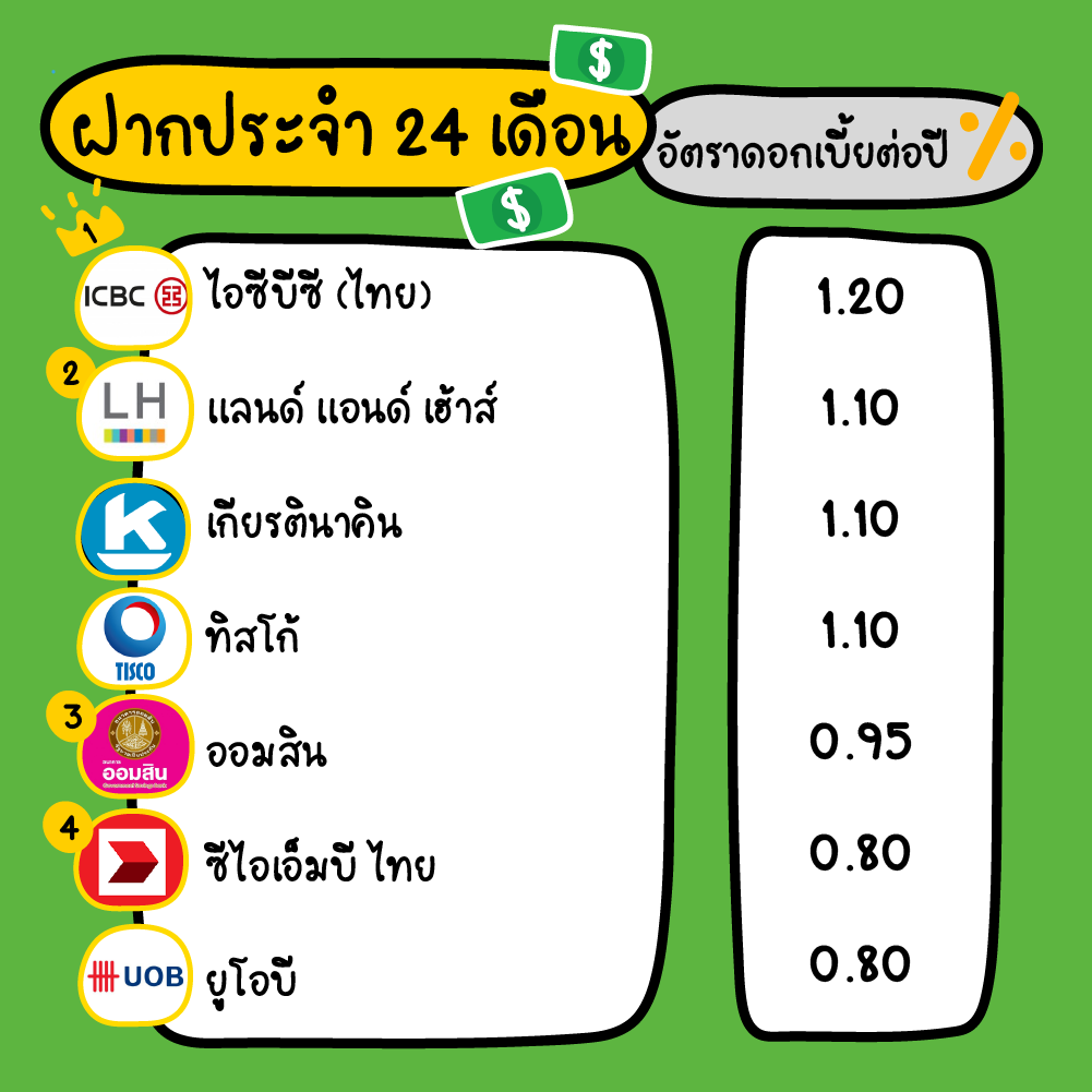 อีกหนึ่งรูปแบบการออมเงินที่เหมาะกับคนที่ต้องการออมเงินอย่างจริงจัง เพิ่มความมีวินัยด้วยการฝากประจำทุกเดือน ทำให้เราสามารถรู้จำนวนเงินออมและคำนวนเงินดอกเบี้ยที่จะได้ล่วงหน้าคร่าว ๆ ได้เลย โดยจะมีให้เลือกฝากประจำแต่ละธนาคารที่จำนวนแตกต่างกันไป เราจะเลือกที่จำนวนเดือน 3 , 6 , 12 , 24 เดือนนะ ขั้นต่ำในการเปิดบัญชี : ไม่มีขั้นต่ำในการฝาก จำนวนครั้งในการจ่ายดอกเบี้ย : เมื่อครบกำหนดระยะเวลาการฝาก ตามระยะเวลาการฝากที่เลือก ขั้นต่ำในการเปิดบัญชี : 1000 บาท จำนวนครั้งในการจ่ายดอกเบี้ย : เมื่อครบกำหนดระยะเวลาการฝาก ตามระยะเวลาการฝากที่เลือก ขั้นต่ำในการเปิดบัญชี : 5000 บาท จำนวนครั้งในการจ่ายดอกเบี้ย : เมื่อครบกำหนดระยะเวลาการฝาก ตามระยะเวลาการฝากที่เลือก ขั้นต่ำในการเปิดบัญชี : 30,000 บาท จำนวนครั้งในการจ่ายดอกเบี้ย : เมื่อครบกำหนดระยะเวลาการฝาก ตามระยะเวลาการฝากที่เลือก ขั้นต่ำในการเปิดบัญชี : 1000 บาท จำนวนครั้งในการจ่ายดอกเบี้ย : เลือกรับดอกเบี้ยรายงวดได้ ขั้นต่ำในการเปิดบัญชี : 5000 บาท จำนวนครั้งในการจ่ายดอกเบี้ย : เมื่อครบกำหนดระยะเวลาการฝาก ตามระยะเวลาการฝากที่เลือก ขั้นต่ำในการเปิดบัญชี : 1000 บาท จำนวนครั้งในการจ่ายดอกเบี้ย : เมื่อครบกำหนดระยะเวลาการฝาก ตามระยะเวลาการฝากที่เลือก ขั้นต่ำในการเปิดบัญชี : 1000 บาท จำนวนครั้งในการจ่ายดอกเบี้ย : เมื่อครบกำหนดระยะเวลาการฝาก ตามระยะเวลาการฝากที่เลือก ขั้นต่ำในการเปิดบัญชี : 1000 บาท จำนวนครั้งในการจ่ายดอกเบี้ย : เมื่อครบกำหนดระยะเวลาการฝาก ตามระยะเวลาการฝากที่เลือก ขั้นต่ำในการเปิดบัญชี : 1000 บาท จำนวนครั้งในการจ่ายดอกเบี้ย : เมื่อครบกำหนดระยะเวลาการฝาก ตามระยะเวลาการฝากที่เลือก ขั้นต่ำในการเปิดบัญชี : 2000 บาท จำนวนครั้งในการจ่ายดอกเบี้ย : เมื่อครบกำหนดระยะเวลาการฝาก ตามระยะเวลาการฝากที่เลือก ขั้นต่ำในการเปิดบัญชี : 1000 บาท จำนวนครั้งในการจ่ายดอกเบี้ย : เมื่อครบกำหนดระยะเวลาการฝาก ตามระยะเวลาการฝากที่เลือก ขั้นต่ำในการเปิดบัญชี : 1000 บาท จำนวนครั้งในการจ่ายดอกเบี้ย : เมื่อครบกำหนดระยะเวลาการฝาก ตามระยะเวลาการฝากที่เลือก ขั้นต่ำในการเปิดบัญชี : 1000 บาท จำนวนครั้งในการจ่ายดอกเบี้ย : เมื่อครบกำหนดระยะเวลาการฝาก ตามระยะเวลาการฝากที่เลือก ขั้นต่ำในการเปิดบัญชี : 1000 บาท จำนวนครั้งในการจ่ายดอกเบี้ย : เมื่อครบกำหนดระยะเวลาการฝาก ตามระยะเวลาการฝากที่เลือก ขั้นต่ำในการเปิดบัญชี : 1000 บาท จำนวนครั้งในการจ่ายดอกเบี้ย : เมื่อครบกำหนดระยะเวลาการฝาก ตามระยะเวลาการฝากที่เลือก ขั้นต่ำในการเป