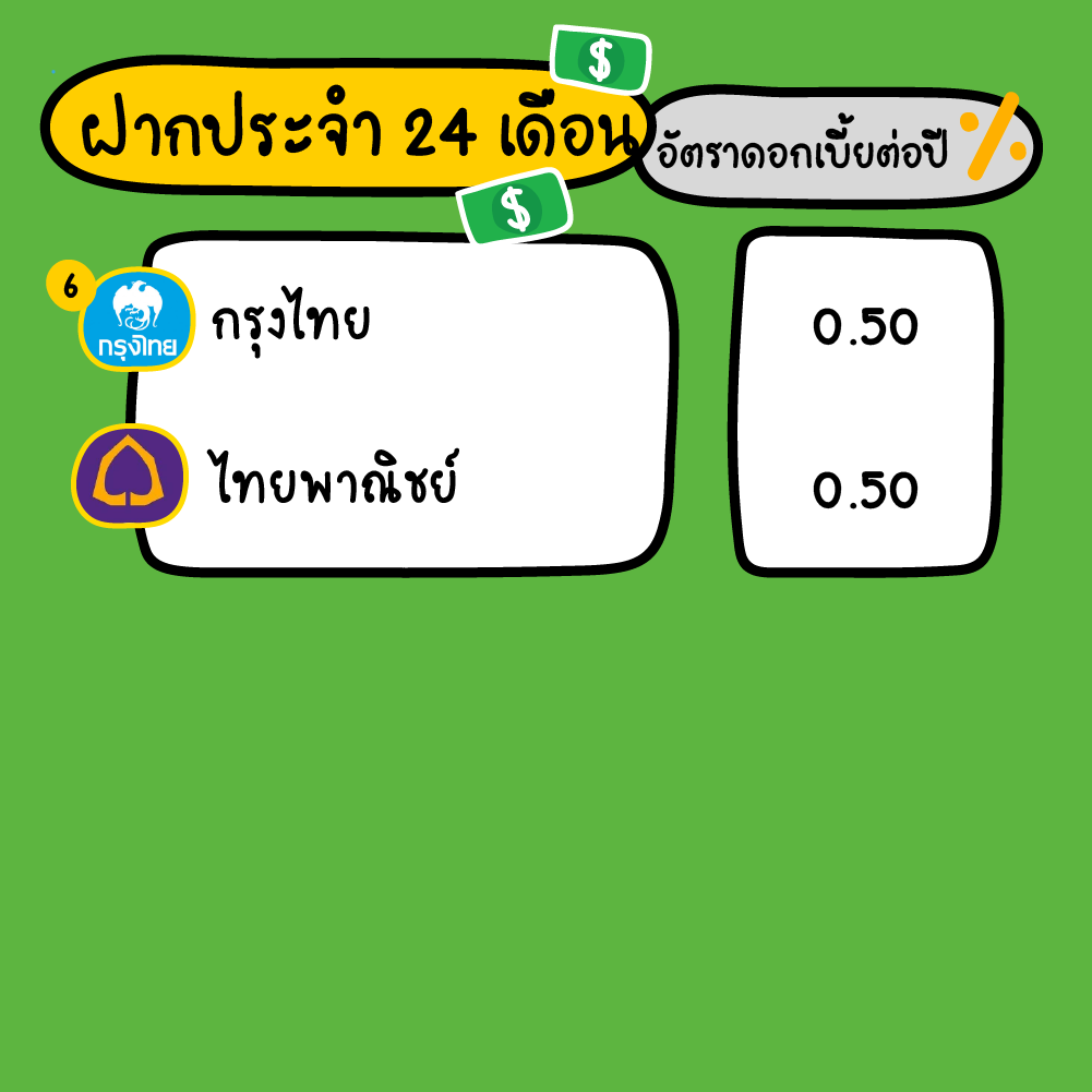เนื่องจากการฝากประจำในจำนวนเงินที่มากๆทำให้มีผลเสียข้อหนึ่งคือมีหักภาษีตามมา ซึ่งใครที่อยากได้เงินดอกเบี้ยแบบเต็มเม็ดเต็มหน่วยก็สามารถเลือกการออมเงินแบบฝากประจำปลอดภาษีได้ ซึ่งจะเริ่มฝากในรูปแบบนี้ได้ตั้งแต่ 24 เดือนขึ้นไปนะ ขั้นต่ำในการเปิดบัญชี : 1000 บาท ขั้นต่ำในการออมแต่ละเดือน : 1000 บาท จำนวนครั้งในการจ่ายดอกเบี้ย : เมื่อครบกำหนดระยะเวลาการฝาก ตามระยะเวลาการฝากที่เลือก ขั้นต่ำในการเปิดบัญชี : 1000 บาท ขั้นต่ำในการออมแต่ละเดือน : 1000 บาท จำนวนครั้งในการจ่ายดอกเบี้ย : เมื่อครบกำหนดระยะเวลาการฝาก ตามระยะเวลาการฝากที่เลือก ขั้นต่ำในการเปิดบัญชี : 1000 บาท ขั้นต่ำในการออมแต่ละเดือน : 1000 บาท จำนวนครั้งในการจ่ายดอกเบี้ย : เมื่อครบกำหนดระยะเวลาการฝาก ตามระยะเวลาการฝากที่เลือก ขั้นต่ำในการเปิดบัญชี : 1000 บาท ขั้นต่ำในการออมแต่ละเดือน : 1000 บาท จำนวนครั้งในการจ่ายดอกเบี้ย : เมื่อครบกำหนดระยะเวลาการฝาก ตามระยะเวลาการฝากที่เลือก ขั้นต่ำในการเปิดบัญชี : 1000 บาท ขั้นต่ำในการออมแต่ละเดือน : 1000 บาท จำนวนครั้งในการจ่ายดอกเบี้ย : เมื่อครบกำหนดระยะเวลาการฝาก ตามระยะเวลาการฝากที่เลือก ขั้นต่ำในการเปิดบัญชี : 500 บาท ขั้นต่ำในการออมแต่ละเดือน : 500 บาท จำนวนครั้งในการจ่ายดอกเบี้ย : เมื่อครบกำหนดระยะเวลาการฝาก ตามระยะเวลาการฝากที่เลือก ขั้นต่ำในการเปิดบัญชี : 500 บาท ขั้นต่ำในการออมแต่ละเดือน : 500 บาท จำนวนครั้งในการจ่ายดอกเบี้ย : เมื่อครบกำหนดระยะเวลาการฝาก ตามระยะเวลาการฝากที่เลือก ขั้นต่ำในการเปิดบัญชี : 1000 บาท ขั้นต่ำในการออมแต่ละเดือน : 1000 บาท จำนวนครั้งในการจ่ายดอกเบี้ย : เมื่อครบกำหนดระยะเวลาการฝาก ตามระยะเวลาการฝากที่เลือก ขั้นต่ำในการเปิดบัญชี : 1000 บาท ขั้นต่ำในการออมแต่ละเดือน : 1000 บาท จำนวนครั้งในการจ่ายดอกเบี้ย : เมื่อครบกำหนดระยะเวลาการฝาก ตามระยะเวลาการฝากที่เลือก ขั้นต่ำในการเปิดบัญชี : 100 บาท ขั้นต่ำในการออมแต่ละเดือน : 100 บาท จำนวนครั้งในการจ่ายดอกเบี้ย : เมื่อครบกำหนดระยะเวลาการฝาก ตามระยะเวลาการฝากที่เลือก ขั้นต่ำในการเปิดบัญชี : 1000 บาท ขั้นต่ำในการออมแต่ละเดือน : 500 บาท จำนวนครั้งในการจ่ายดอกเบี้ย : เมื่อครบกำหนดระยะเวลาการฝาก ตามระยะเวลาการฝากที่เลือก ขั้นต่ำในการเปิดบัญชี : 1000 บาท ขั้นต่ำในการออมแต่ละเดือน : 1000 บาท จำนวนครั้งในการจ่ายดอกเบี้ย : เมื่อครบกำหนดระยะเวลาการฝาก ตามระยะเวลาการฝากที่เลือก ขั้นต่ำในการเปิดบัญชี : 1000 บาท ขั้นต่ำในการออมแต่ละเดือน : 1000 บาท จำนวนครั้งในการจ่ายดอกเบี้ย : เมื่อครบกำหนดระยะเวลาการฝาก ตามร