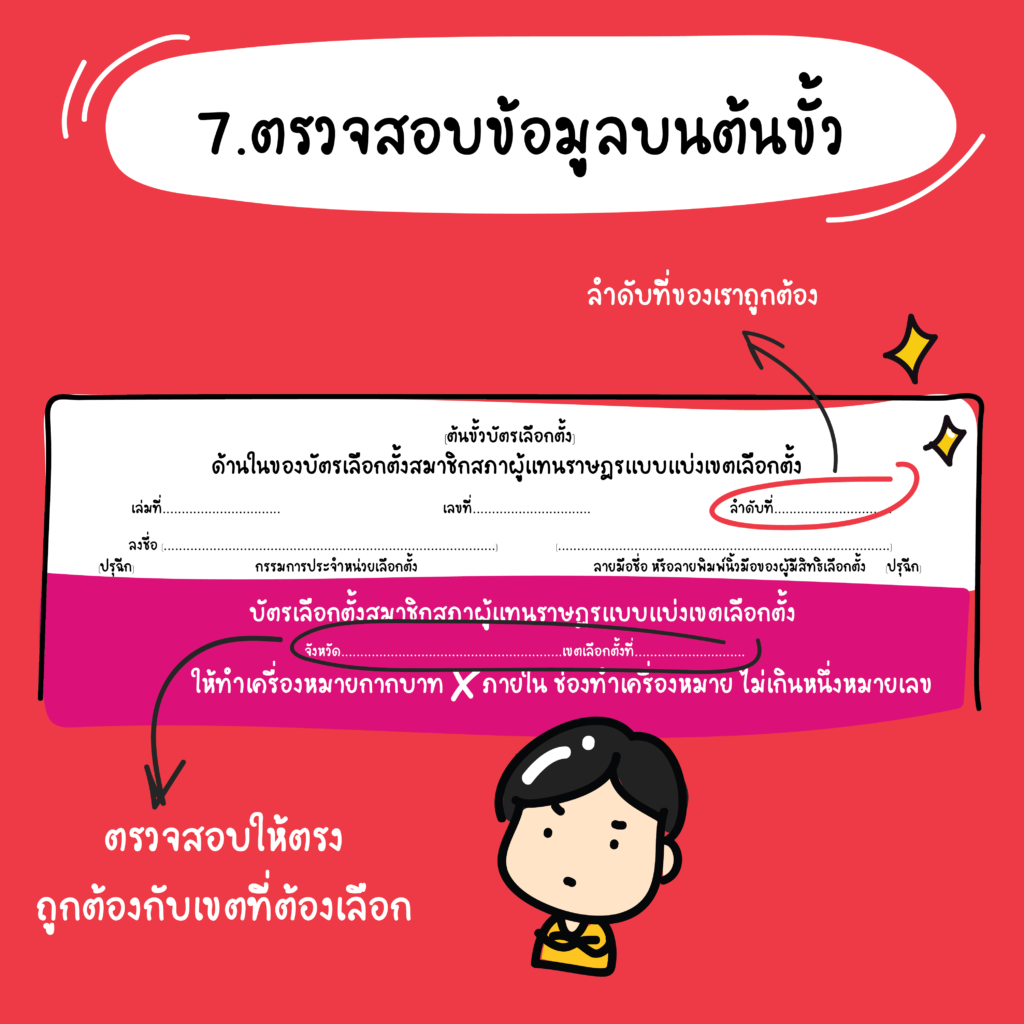 เราจะต้องเซ็นที่ต้นขั้วเพื่อยืนยันการรับบัตรเลือกตั้ง ให้อ่านข้อมูลบนต้นขั้วให้ดีก่อนที่จะลงลายเซ็นใด ๆ บนต้นขั้ว
