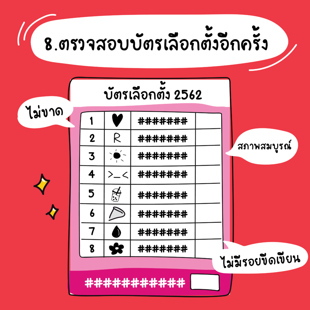 ก่อนเข้าคูหากวาดตามองบัตรเลือกตั้งที่ได้รับว่าไม่มีรอยขาด รอยชำรุด หรือการขีดเขียนใด ๆ บนบัตรเลือกตั้ง