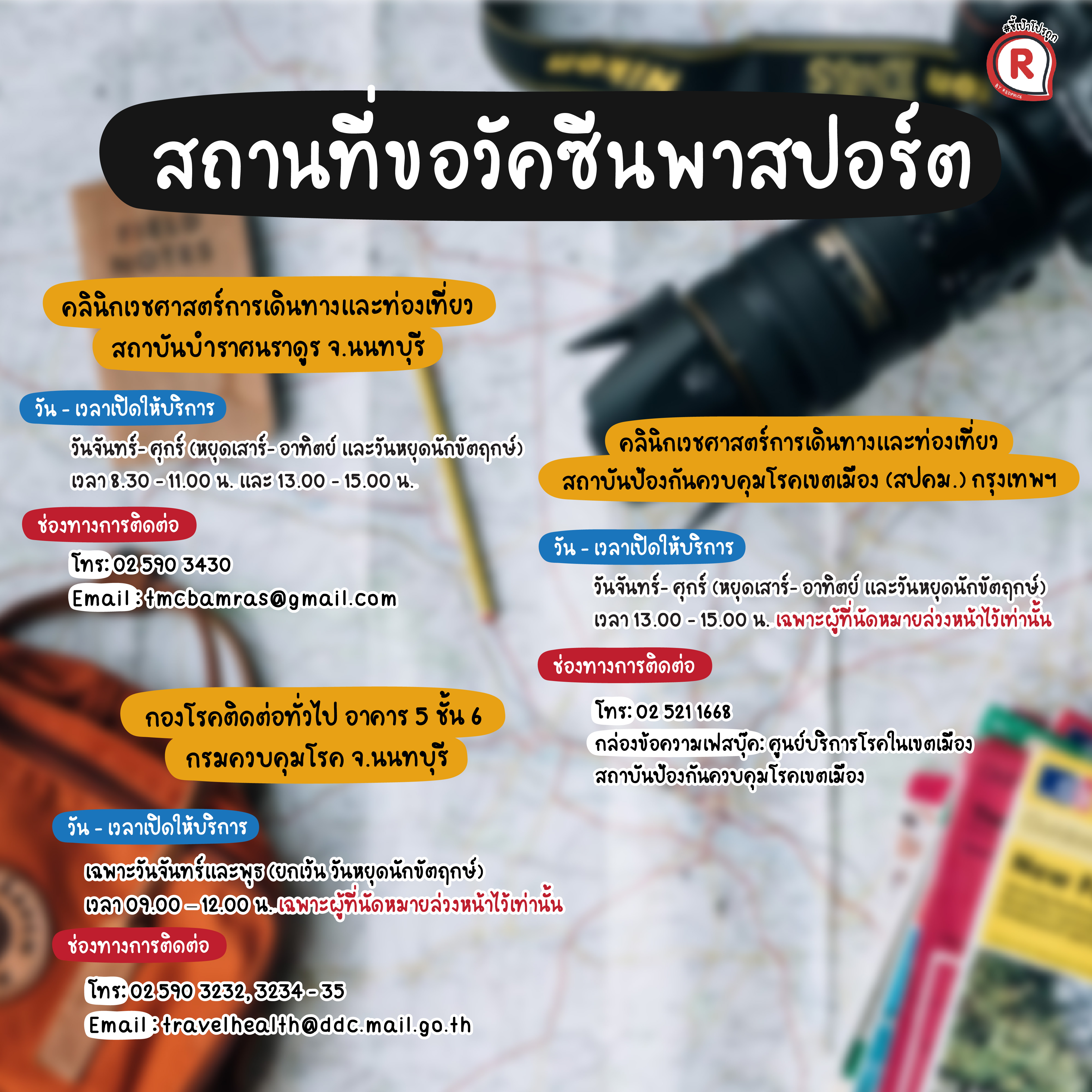 2.คลินิกเวชศาสตร์การเดินทางและท่องเที่ยว สถาบันป้องกันควบคุมโรคเขตเมือง (สปคม.) กรุงเทพฯ